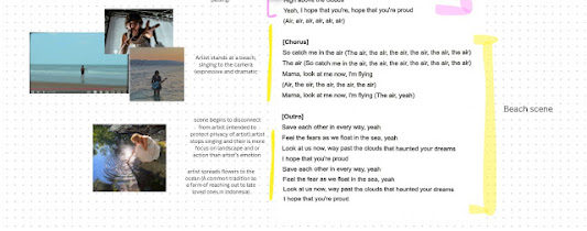 Reflection: The annotating process on this lyric sheet was quite fun as my group and I got to brainstorm multiple ideas for each verses of the song. However we experienced a few difficulties on what to do on certain verses as what was important to us was making a clear flow in the narrative we want to create taking into account that we are including flashback and flashforward cuts. Thus, we had several discussions in our WhatsApp group chat to come into a conclusion as well as asking our teacher for feedbacks regarding what he thinks would be fitting to do for the verse.